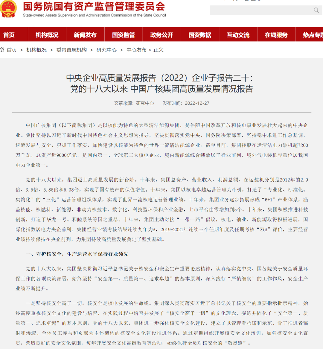 12月27日,國務(wù)院國資委官網(wǎng)刊發(fā)黨的十八大以來中國廣核集團(tuán)高質(zhì)量發(fā)展情況報(bào)告,報(bào)告從多個(gè)角度展示中廣核近十年的成績(jī)和發(fā)展,聚焦安全生產(chǎn)、科技創(chuàng)新、產(chǎn)業(yè)布局、深化改革、黨的建設(shè)、社會(huì)責(zé)任等方面,展現(xiàn)中廣核持續(xù)推動(dòng)高質(zhì)量發(fā)展,加快建設(shè)世界一流企業(yè)的穩(wěn)健步伐。
