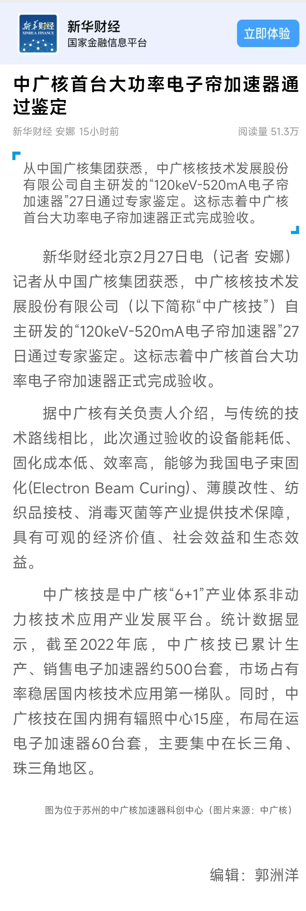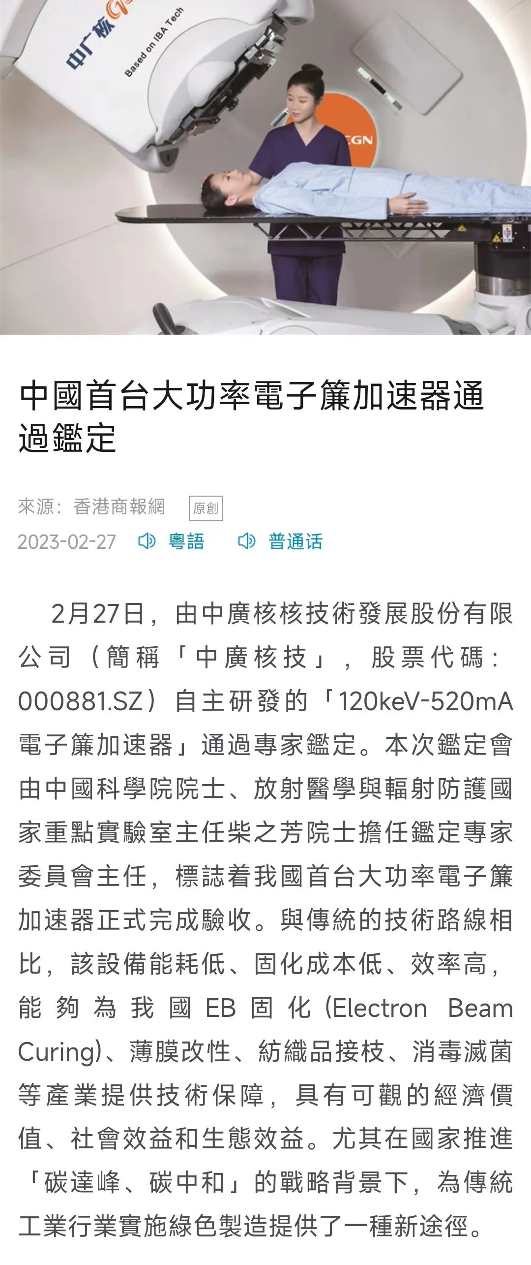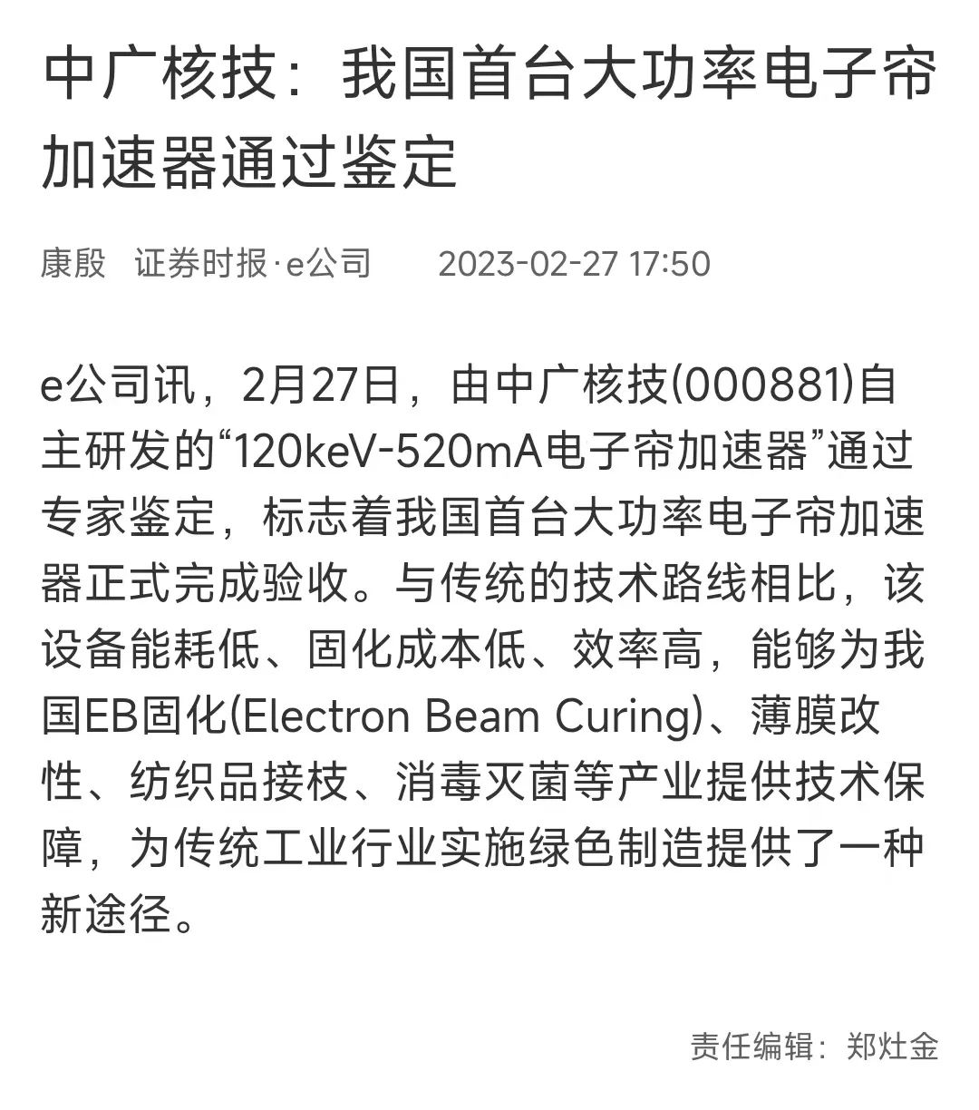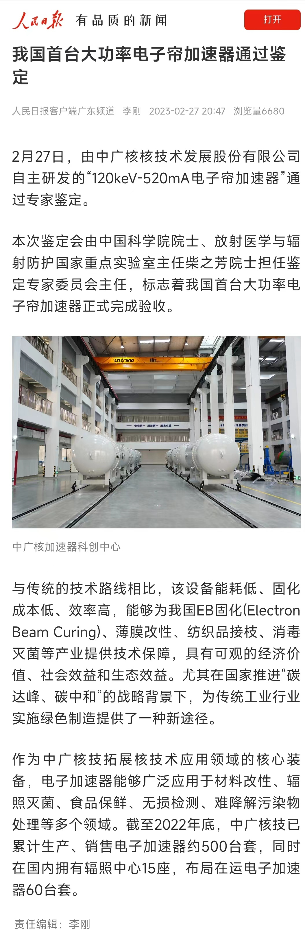 2月27日,由中廣核核技術發展股份有限公司(股票代碼:000881.SZ)聯合中科院近物所研發的“120keV-520mA電子簾加速器”通過專家鑒定。本次鑒定會由同輻行業協會組織,中國科學院院士、放射醫學與輻射防護國家重點實驗室主任柴之芳院士擔任鑒定專家委員會主任,標志著我國首臺大功率電子簾加速器正式完成驗收。與傳統的技術路線相比,該設備能耗低、固化成本低、效率高,能夠為我國EB固化(Electron Beam Curing)、薄膜改性、紡織品接枝、消毒滅菌等產業提供技術保障,具有可觀的經濟價值、社會效益和生態效益。尤其在我國推進“碳達峰、碳中和”的戰略背景下,為傳統工業行業實施綠色制造提供了一種新途徑。