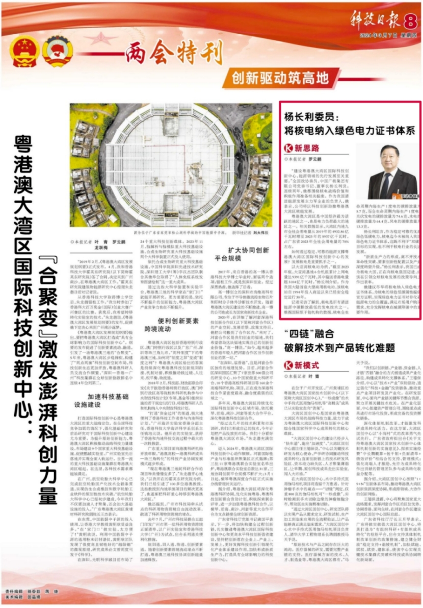 “建設(shè)粵港澳大灣區(qū)國際科技創(chuàng)新中心,能源領(lǐng)域的先行發(fā)展至關(guān)重要。”全國政協(xié)委員,中國廣核集團(tuán)有限公司黨委書記、董事長(zhǎng)楊長(zhǎng)利說。連續(xù)兩年,他都圍繞核電戰(zhàn)略價(jià)值和積極作用準(zhǔn)備相關(guān)提案。作為我國清潔能源發(fā)展主力軍企業(yè)的負(fù)責(zé)人,他表示,公司將以科技創(chuàng)新助推粵港澳大灣區(qū)核能發(fā)展。