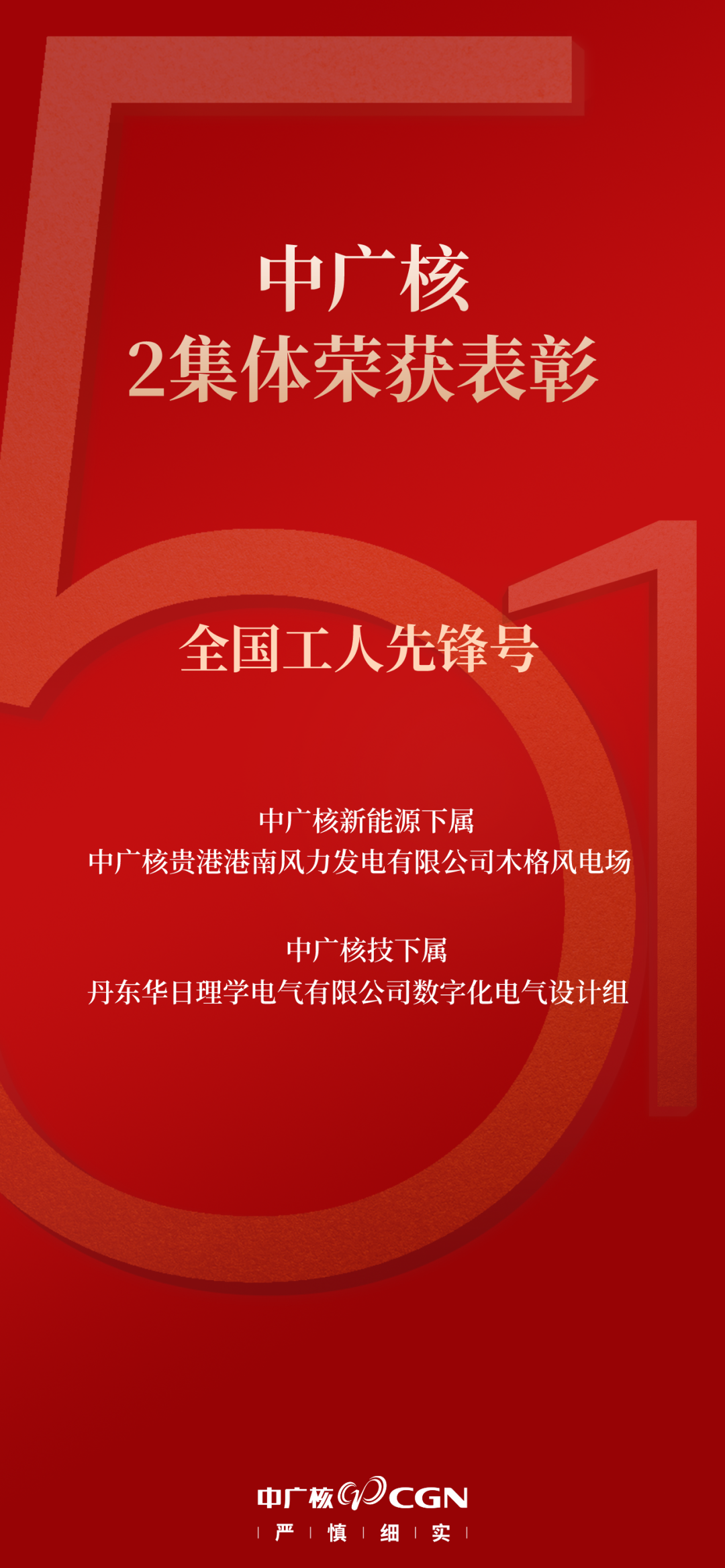 4月28日,2024年慶祝“五一”國際勞動節暨全國五一勞動獎和全國工人先鋒號表彰大會在北京人民大會堂舉行。中國廣核集團2個集體榮獲表彰——中廣核新能源下屬貴港港南風力發電有限公司木格風電場和中廣核技下屬丹東華日理學電氣有限公司數字化電氣設計組,被全國總工會授予“全國工人先鋒號”榮譽稱號。