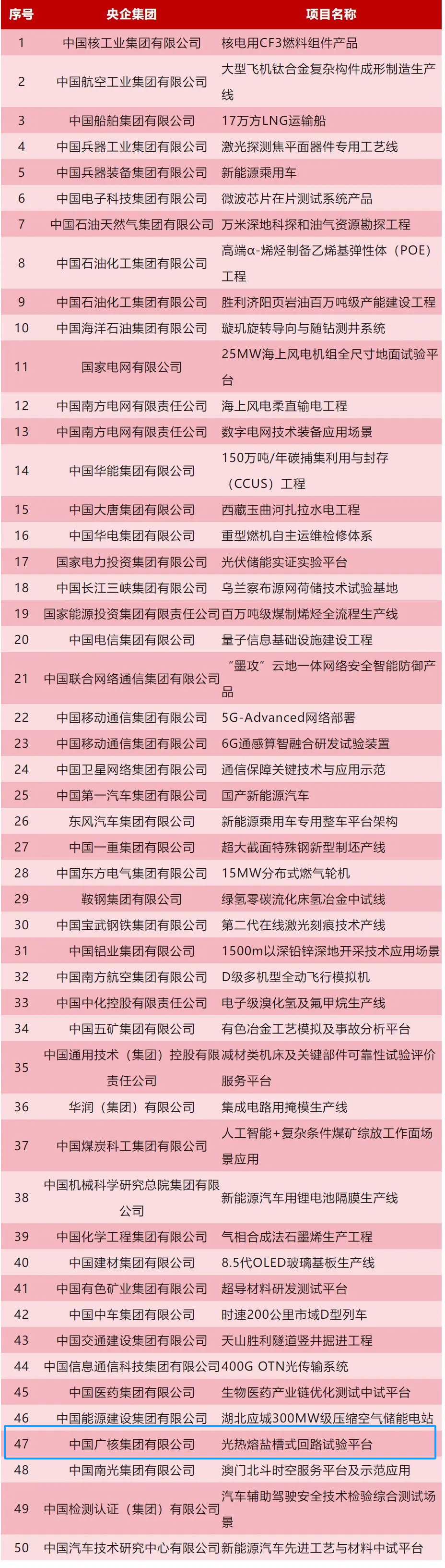 近日,國務院國資委、工業和信息化部、國家能源局聯合印發中央企業科技成果應用拓展工程首批項目清單,遴選確定產線帶動、產品牽引、工程推動、中試平臺、場景創建等5類共計50個項目。中國廣核集團有限公司“光熱熔鹽槽式回路試驗平臺”項目作為光熱領域唯一項目入圍。