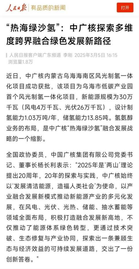 《人民日報》:中廣核正在風電、光伏、光熱、氫能等領域全面布局,以“熱海綠沙氫”戰略擘畫產業融合新圖景,通過技術突破、生態修復與產業協同,探索出一條兼顧生態與經濟效益的可持續發展道路。