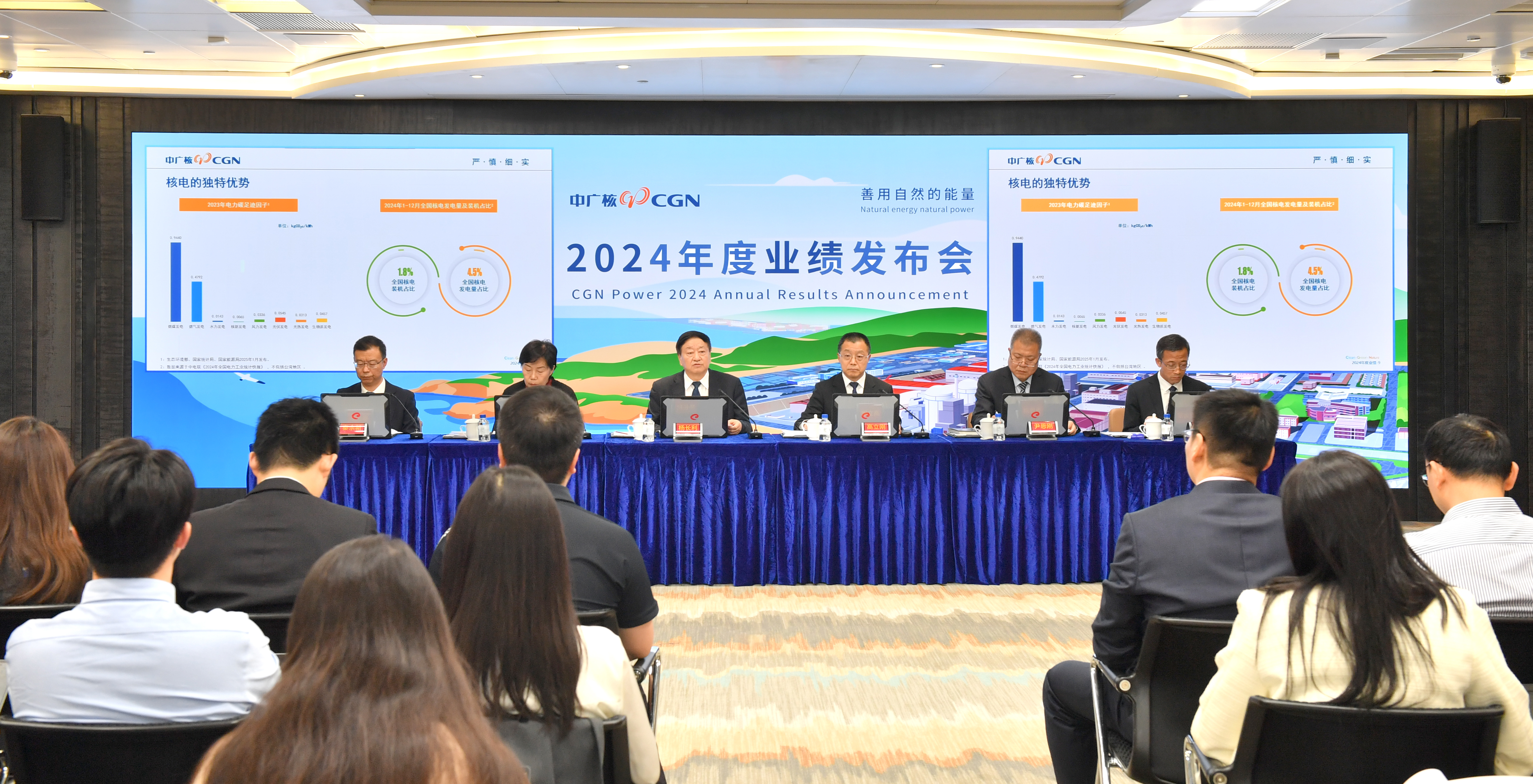 2025年3月27日,中國廣核電力股份有限公司(以下簡稱“中廣核電力”或“公司”,香港聯合交易所代號:1816.HK,深圳證券交易所代號:003816.SZ)在深圳召開2024年度業績發布會。2024年,中廣核電力深入貫徹落實新發展理念,以綠色低碳引領高質量發展,嚴守核安全,保持穩健經營,經營業績保持穩健,年度上網電量達2272.84億千瓦時,公司管理的6臺機組獲得國家核準,在運、在建機組裝機容量超過5120萬千瓦。中廣核電力董事長楊長利,執行董事、總裁高立剛,獨立董事徐華,財務總監、董事會秘書尹恩剛,副總裁秦余新、劉海軍出席會議。