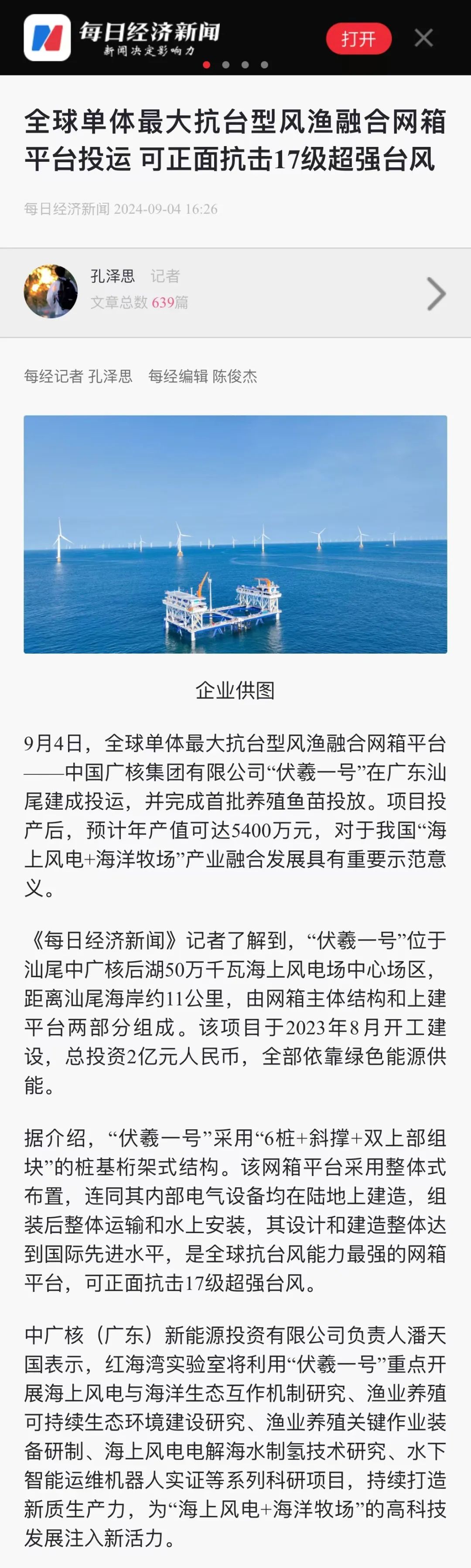 9月4日,中廣核汕尾“伏羲一號”風漁融合項目正式投運,并完成首批養殖魚苗投放,該項目可正面抗擊17級超強臺風,預計投產后年產值可達5400萬元,對于我國“海上風電+海洋牧場”產業融合發展具有重要示范意義。人民日報、新華社、央視等數十家主流媒體對此進行聚焦報道。