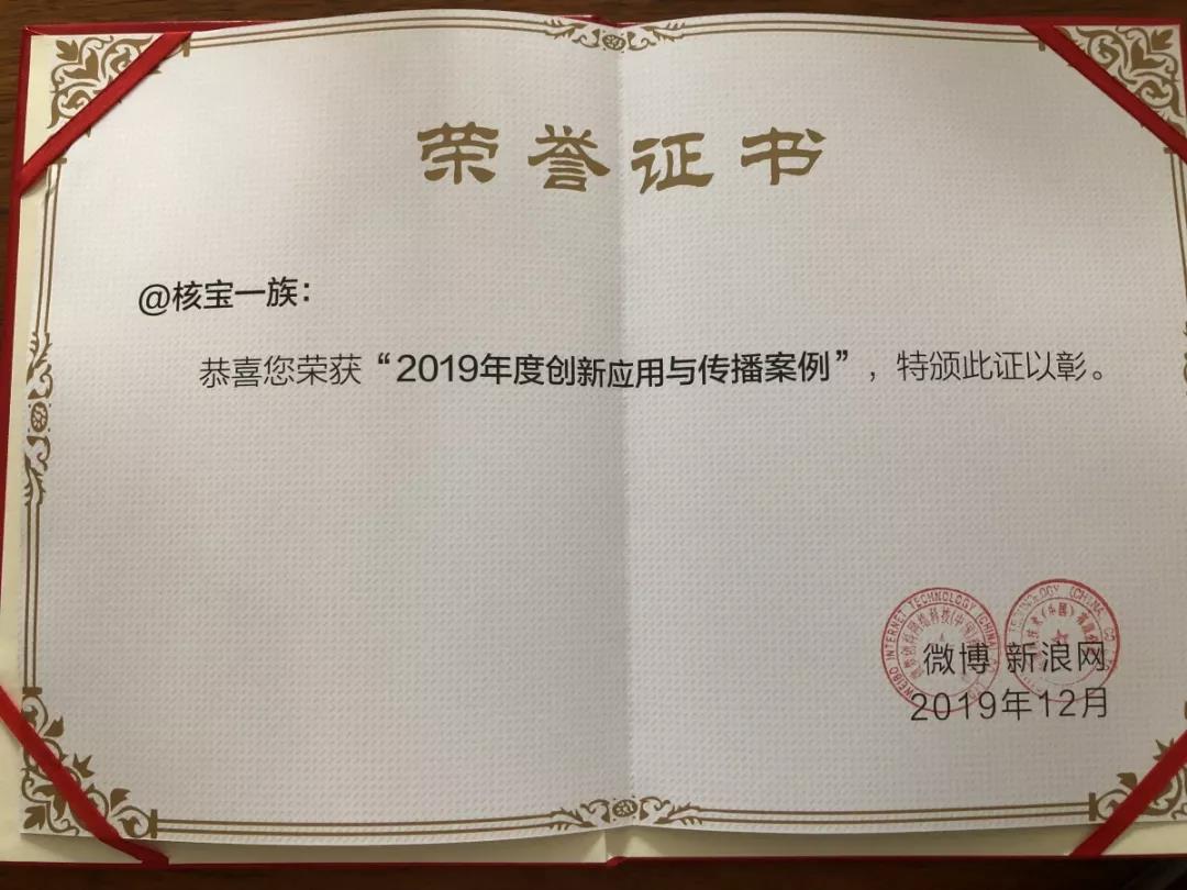2019年12月30日微博與新浪網(wǎng)主辦的致敬初心·微博十年政務(wù)微博之夜于天津舉行中廣核獲“創(chuàng)新應(yīng)用與傳播案例獎”