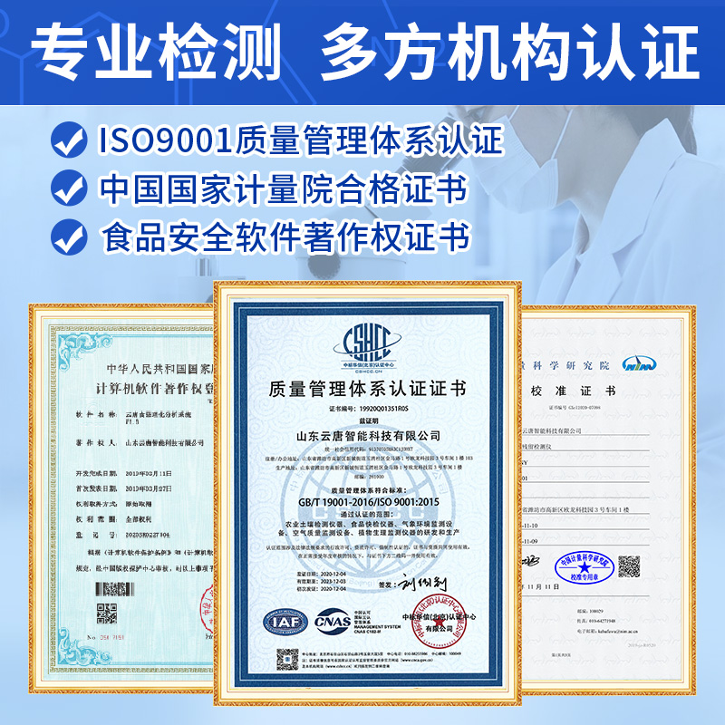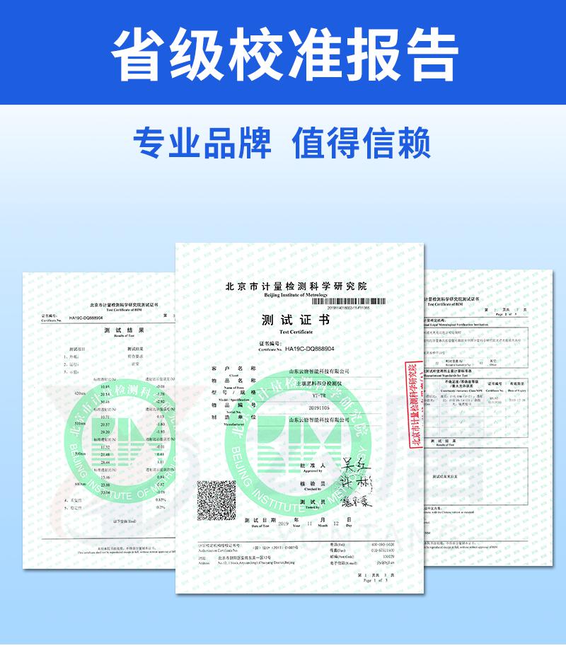 5、檢測過程中內置校準功能,智能恒流穩壓,光強自動校準,確保檢測準確度,取得中國計量科學研究院的《校準證書》。