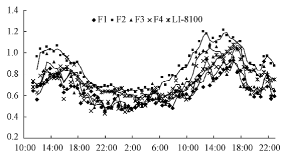 圖b RR-7330測量系統(tǒng)四個(gè)通道測量的土壤呼吸與li-8100測量日變化對比(中國林科院,高峻,2011)